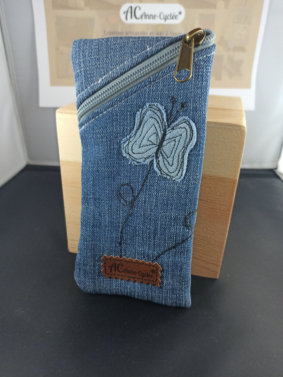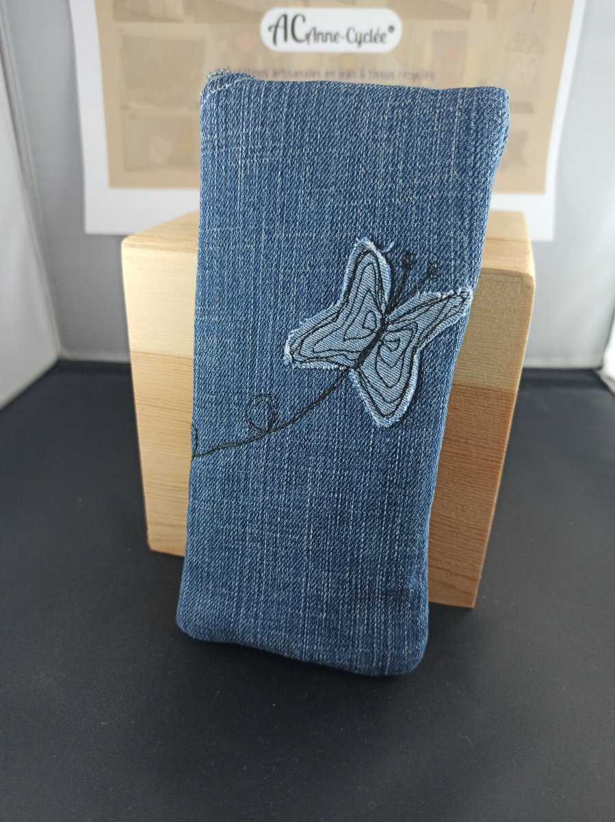 Étui à lunettes en jean avec papillons appliqués – Anne-Cyclée
