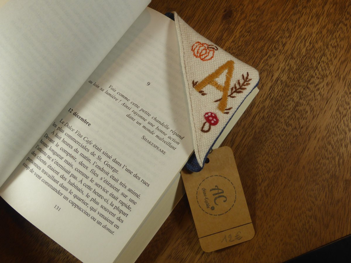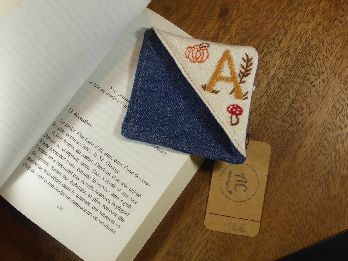 Ce marque-page qui se place au coin de la page est fait main en tissus upcyclés et décoré de broderies délicates sur le thème de l’automne. Pratique et élégant, il maintient votre page avec style tout en apportant une touche chaleureuse à vos lectures.