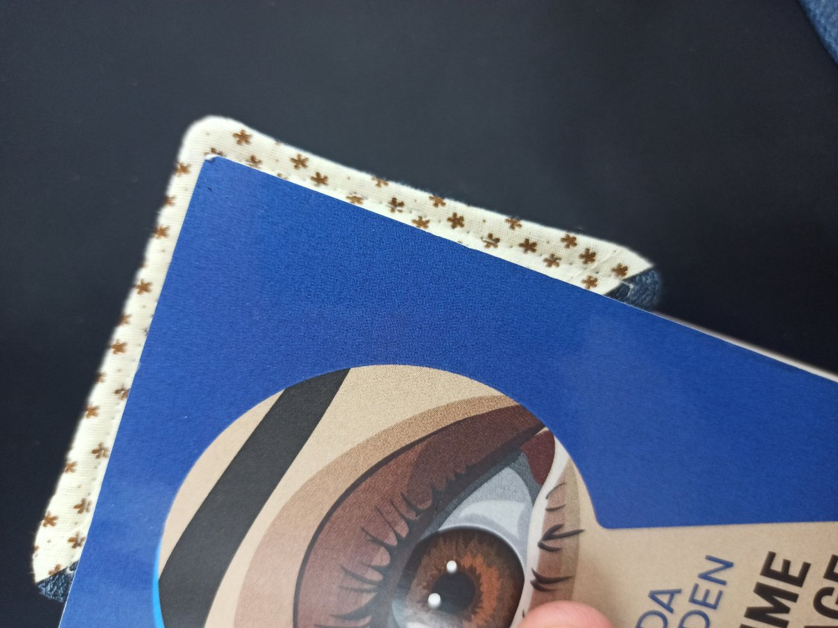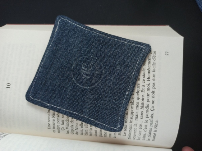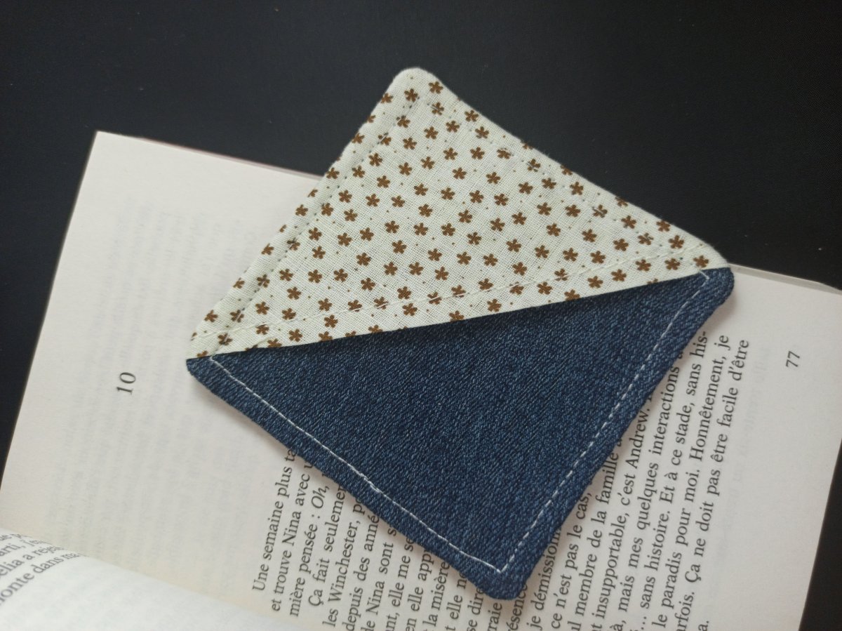 Marque-page d’angle fabriqué à la main à partir de jeans recyclés et de tissus colorés.