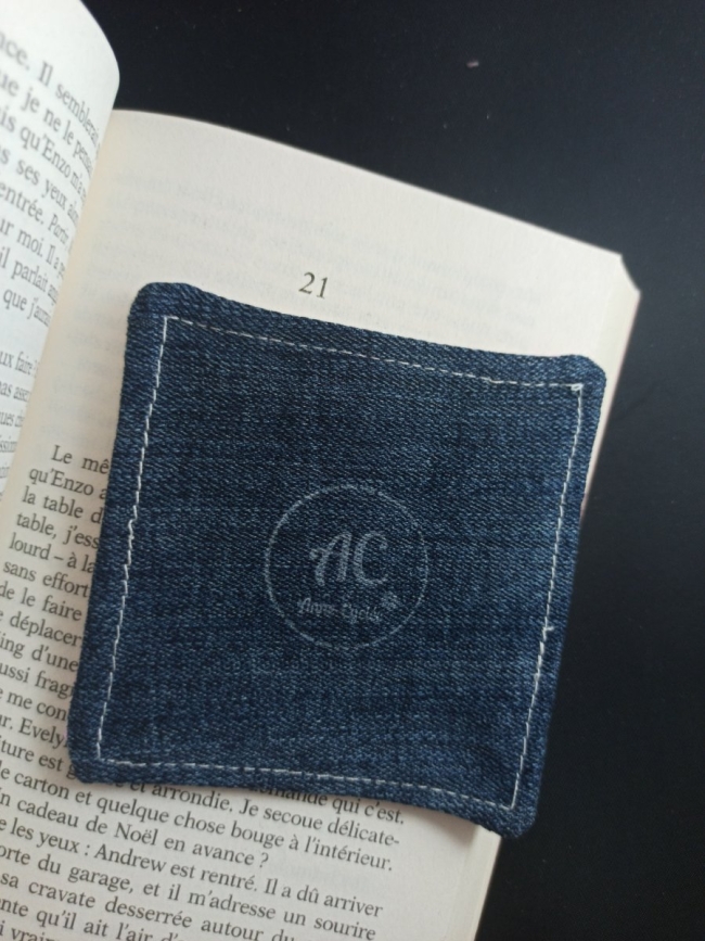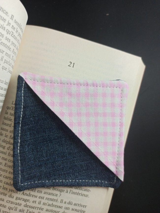 Marque-page d’angle fabriqué à la main à partir de jeans recyclés et de tissus colorés.