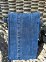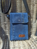 Fonctionnelle, cette pochette en jean recyclé dispose de deux poches au format téléphone ainsi que d’une poche centrale plus étroite, idéale pour glisser un stylo ou de petits objets.