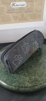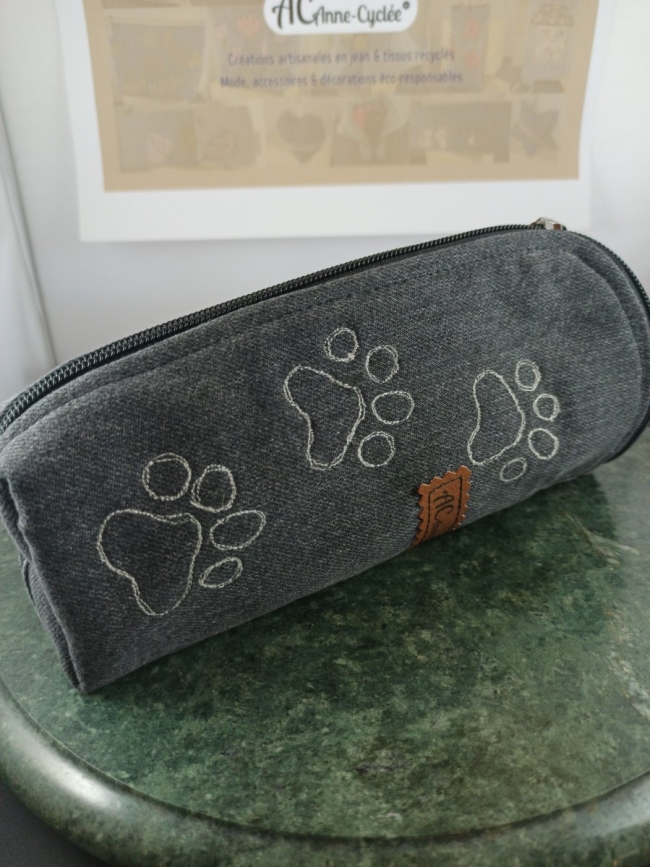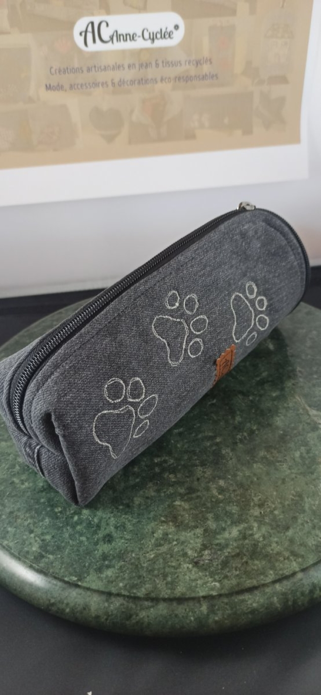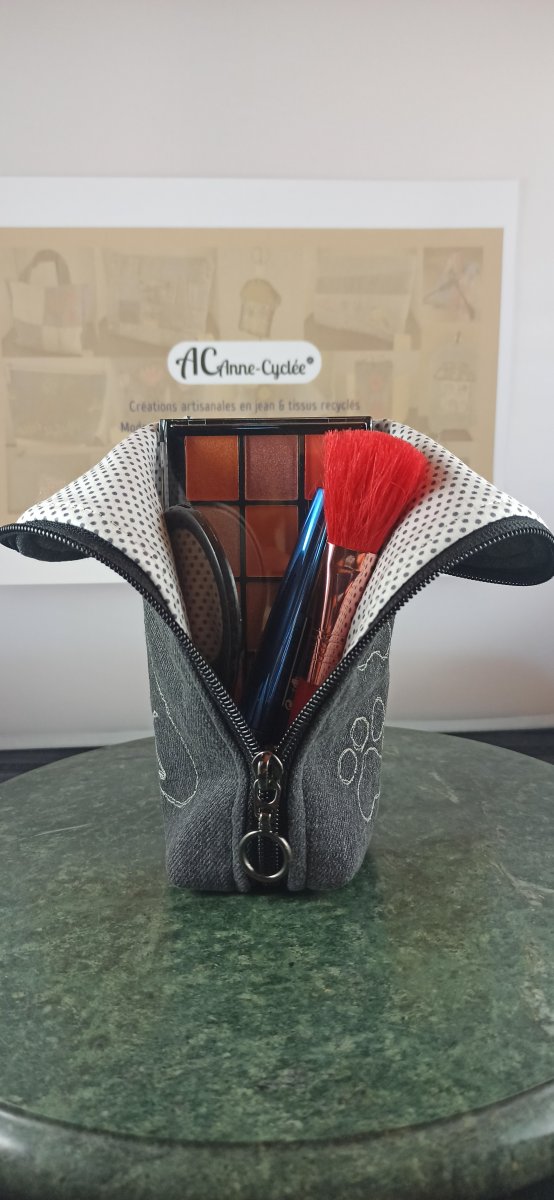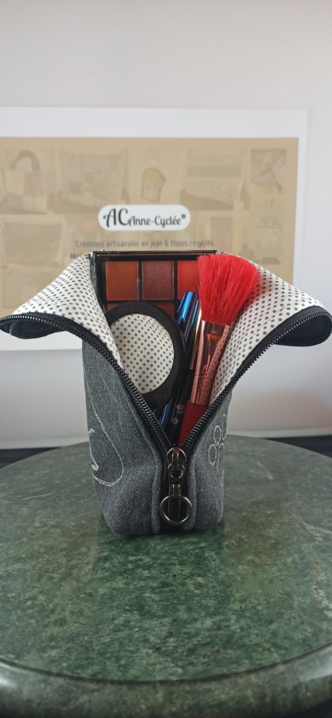 Cette trousse debout est réalisée à partir de matériaux recyclés, dans une démarche d’upcycling artisanale et écoresponsable.