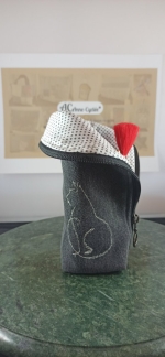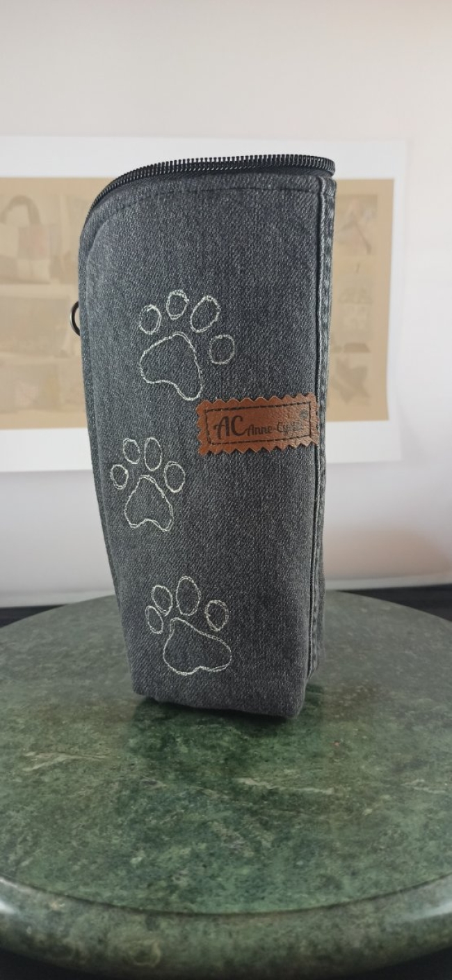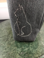 Confectionnée en jean noir recyclé, elle est décorée d’une silhouette de chat brodée, accompagnée d’empreintes de pattes, créant un motif à la fois ludique et élégant grâce au contraste du fil blanc sur fond sombre.