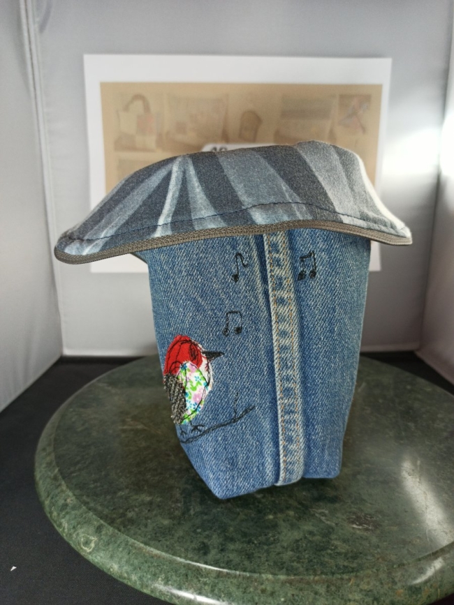 Elle est réalisée en jean bleu recyclé, et décorée d’un appliqué oiseau multicolore réalisé dans divers tissus récupérés, créant une atmosphère joyeuse et créative.