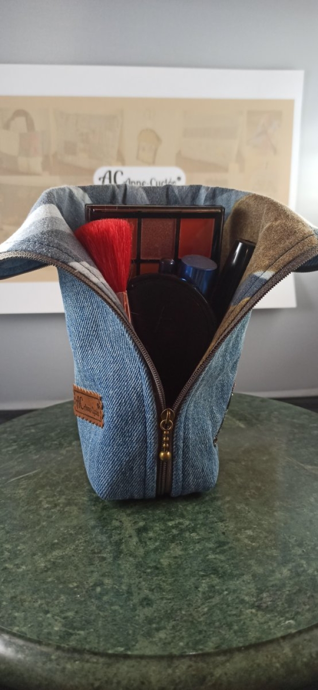 Cette trousse debout écoresponsable est entièrement confectionnée à partir de matériaux recyclés, fidèle à l’esprit d’Anne Cyclée 🌿.