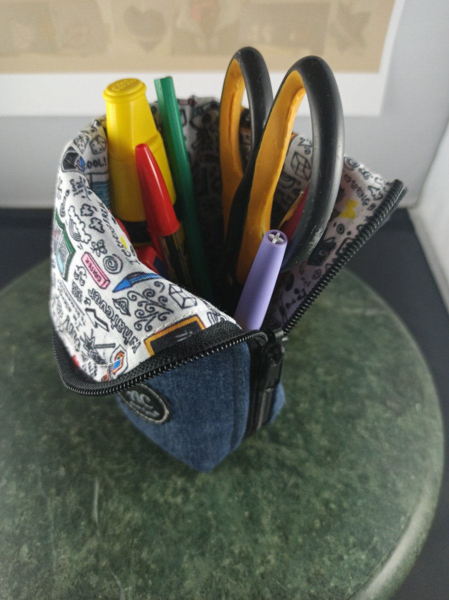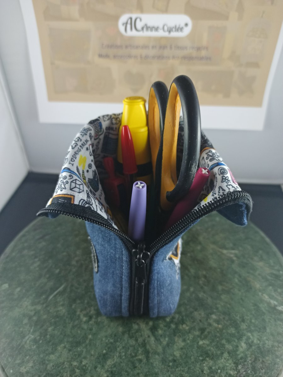 Trousse debout en jean upcyclé, molletonnée pour une bonne tenue et une protection optimale de son contenu.