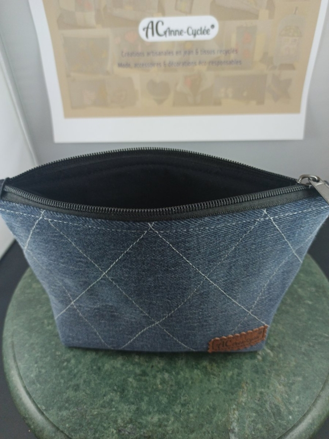 Trousse en denim foncé, ornée d’un motif losanges brodés en fil clair et doublée noire.