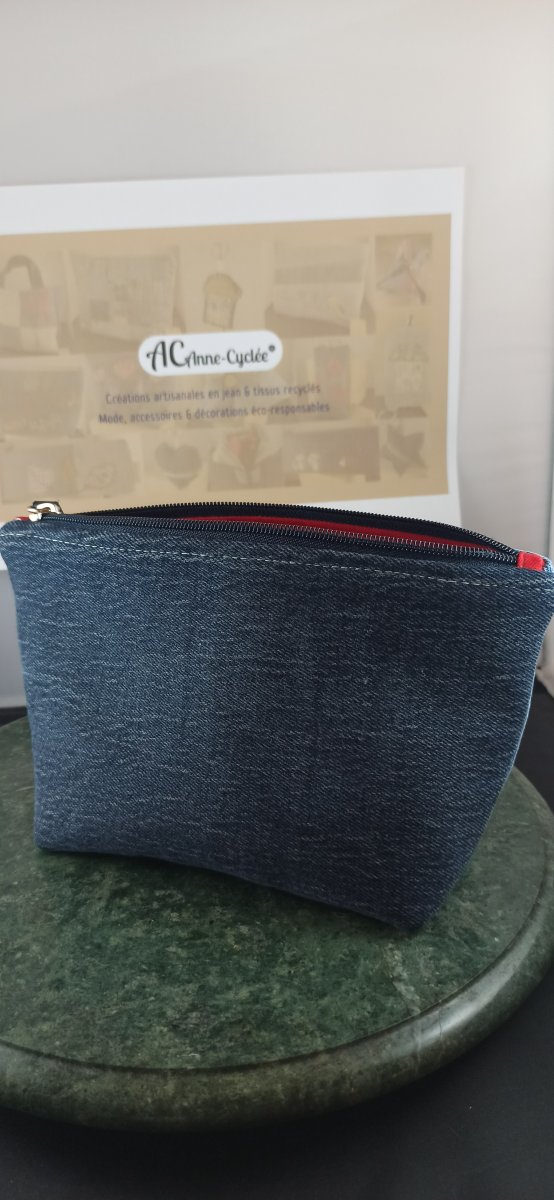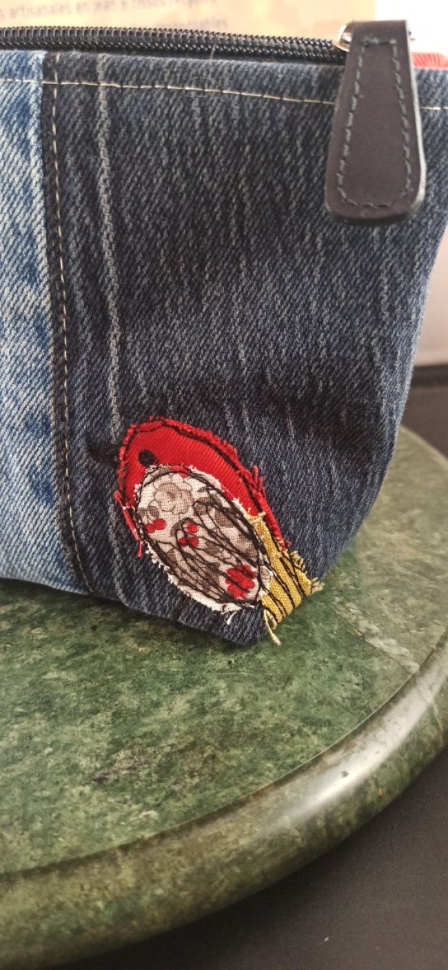Trousse en denim upcyclé avec appliqué petit oiseau rouge
