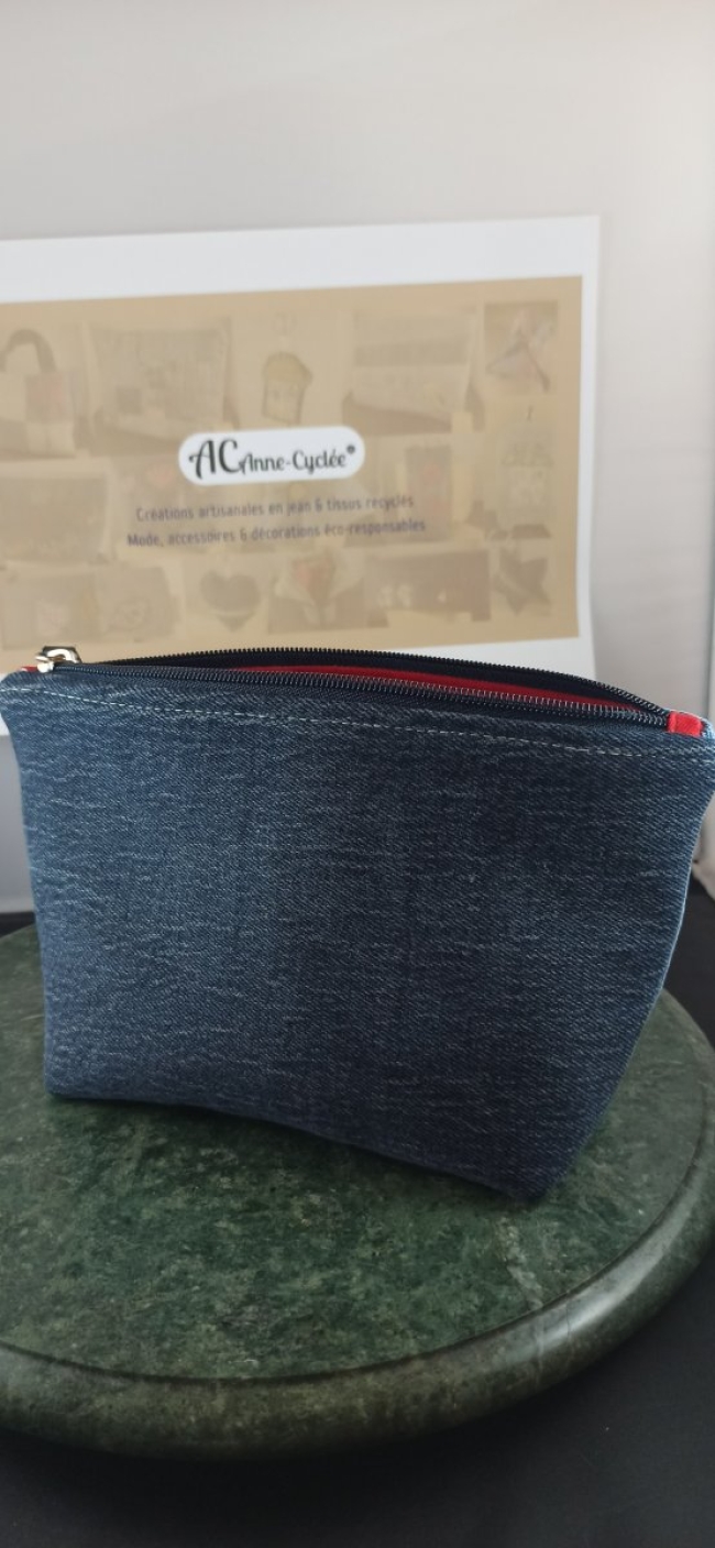 Trousse artisanale en jean upcyclé, sublimée par un petit oiseau en appliqué rouge et fleuri, avec intérieur assorti.