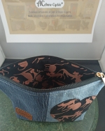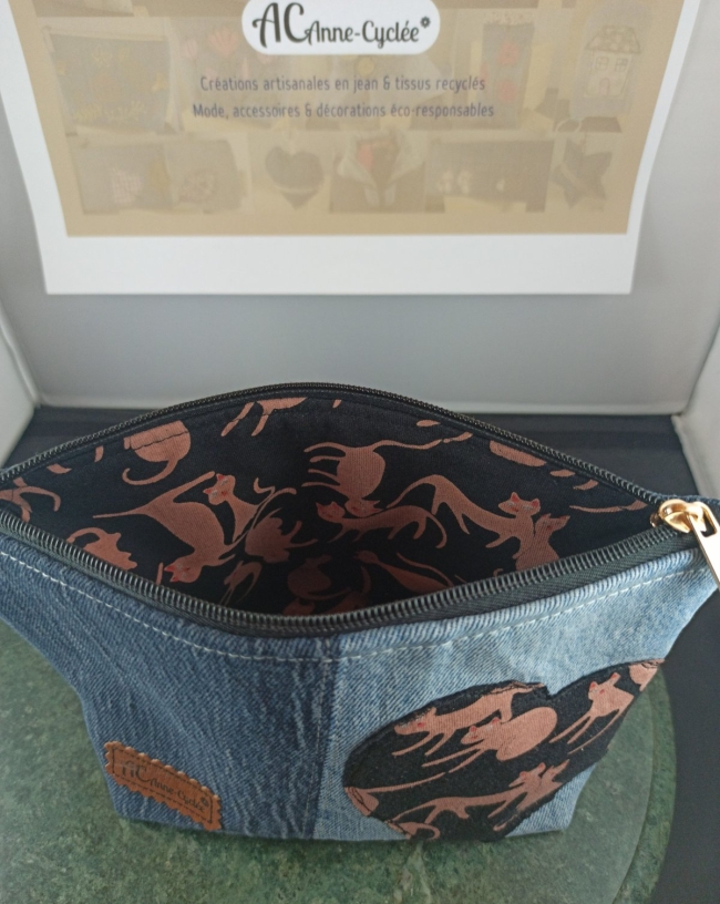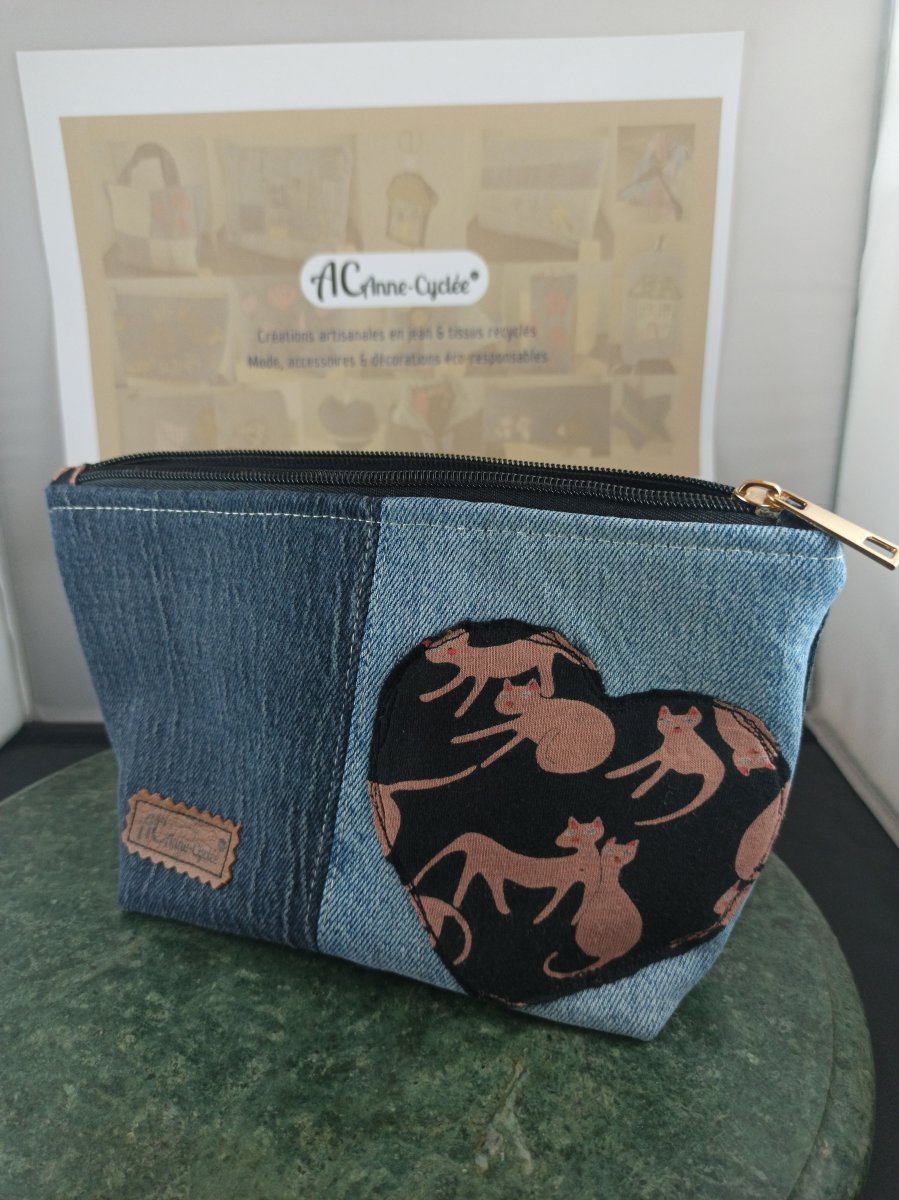 Trousse artisanale en denim upcyclé, décorée d’un cœur en tissu motif chats et doublée du même imprimé.