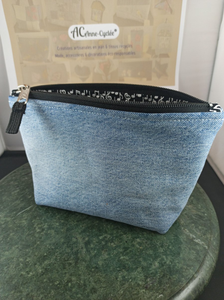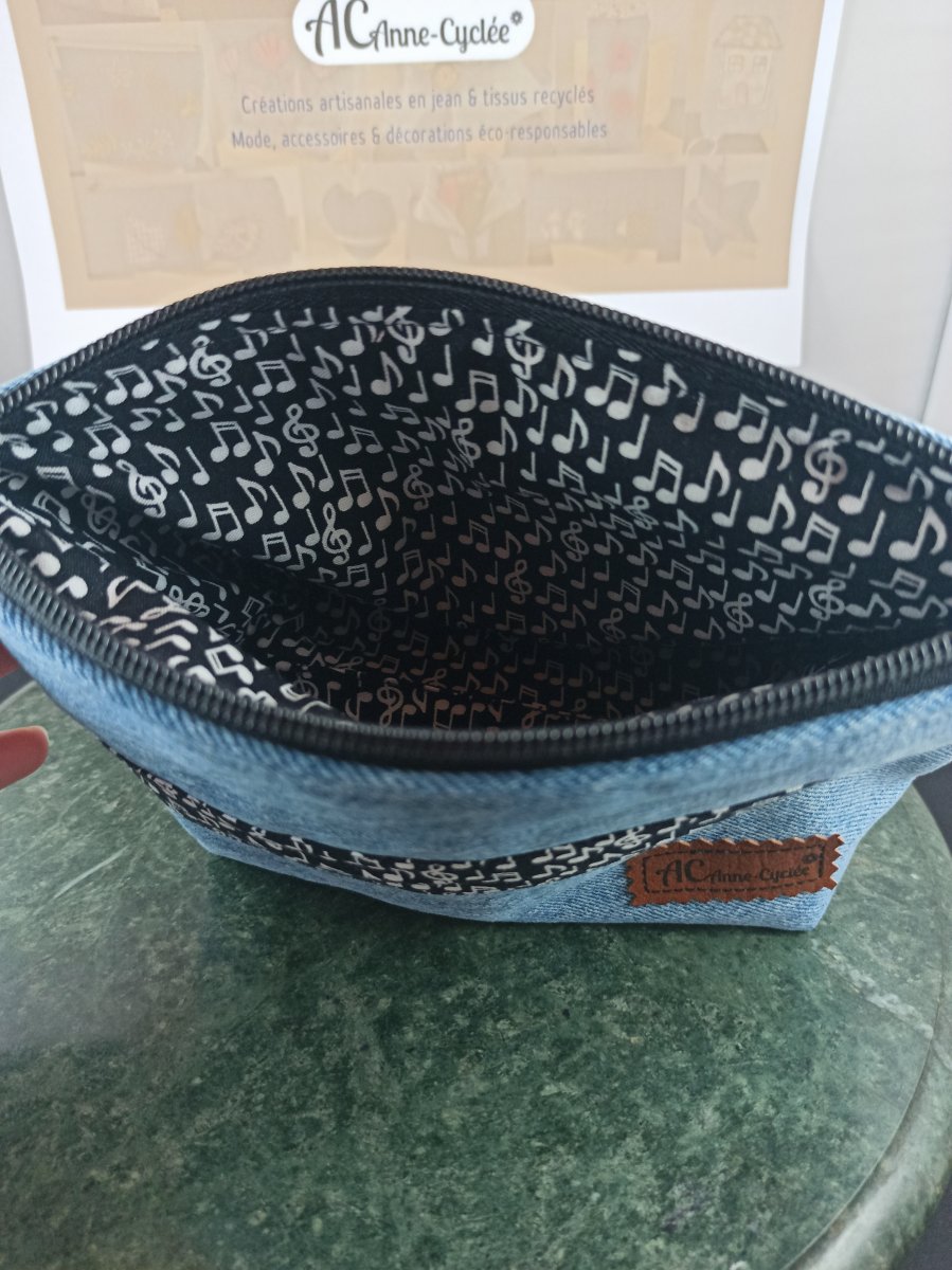 Trousse artisanale en denim upcyclé, ornée d’une bande à motif musical et doublée du même imprimé.
