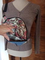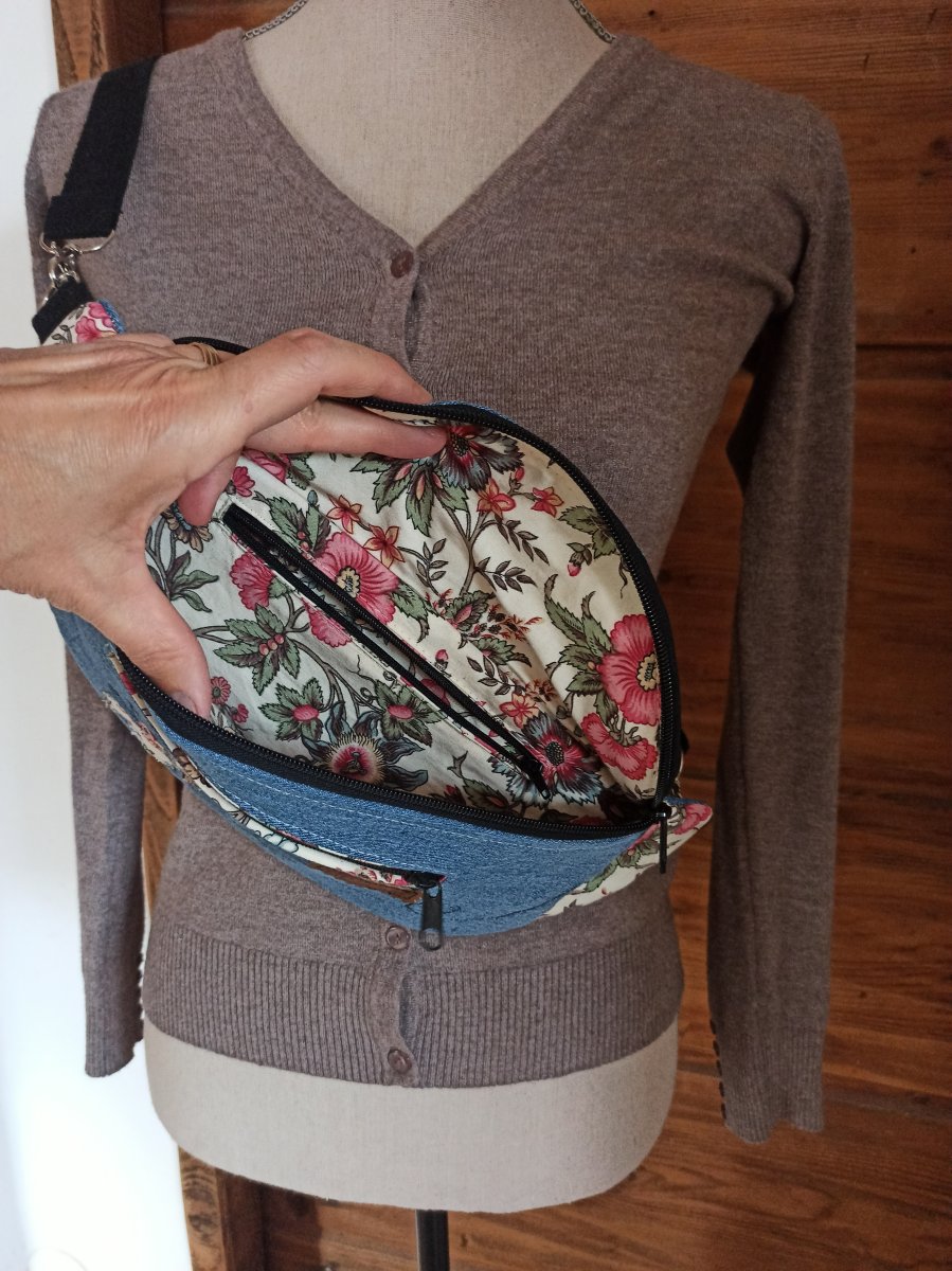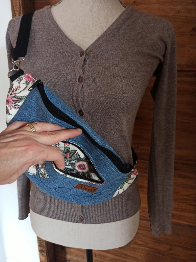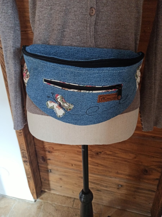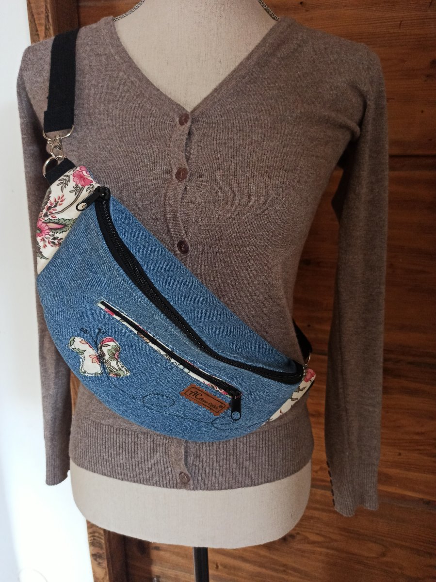 Banane en jean recyclé avec appliqué papillon fleuri, faite main.