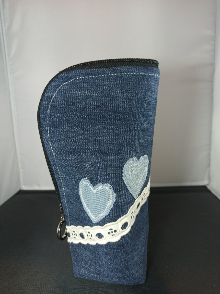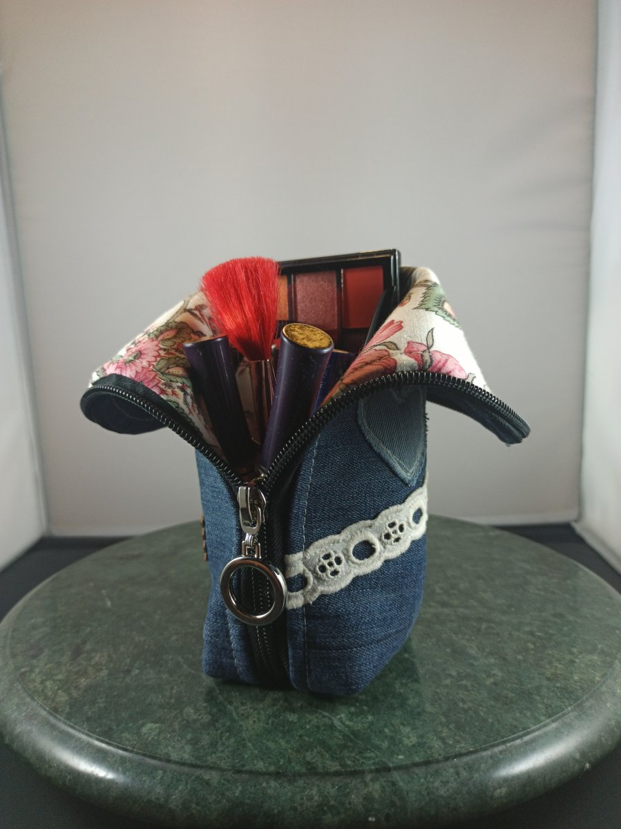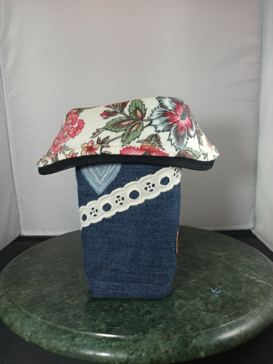 Alliant style, praticité et conscience écologique, cette trousse est fabriquée à partir de jean recyclé délicatement rehaussé d'une touche de dentelle et de coeurs en denim appliqués. Son intérieur fleuri, lui aussi réalisé à partir de tissu recyclé, apporte une note douce et poétique.