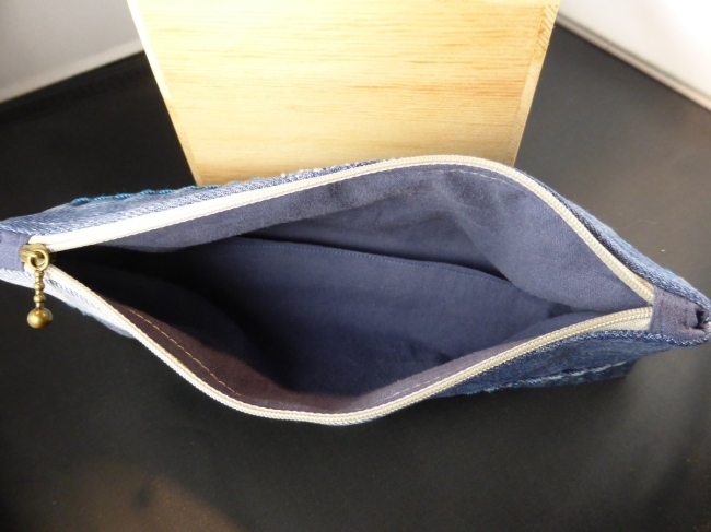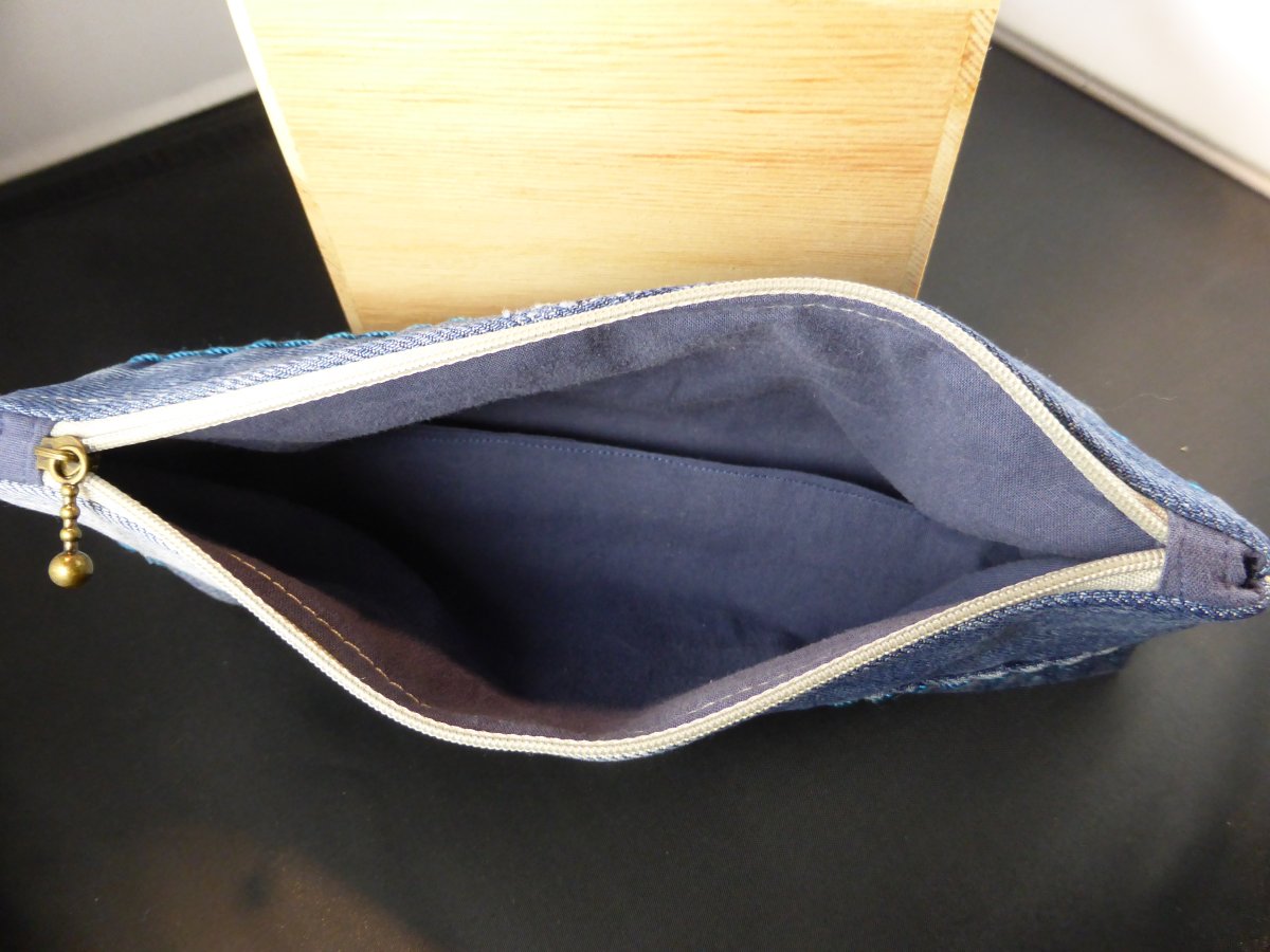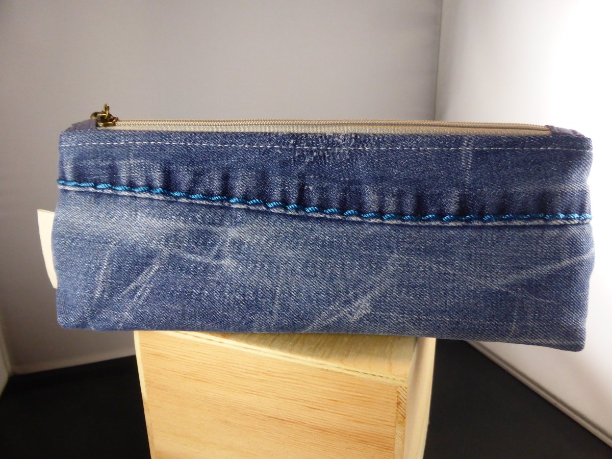Cette trousse format écolier est faite main en jean upcyclé original, qui était déjà brodé, pour une pièce unique. Pratique et polyvalente, elle peut servir à ranger stylos, crayons, pinceaux de maquillage, petites fournitures de bureau, accessoires de couture ou autres petits objets du quotidien, tout en apportant une touche originale et élégante à votre quotidien.Elle fait partie d’une collection de quatre trousses sur le même thème, à découvrir également sur le site.